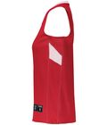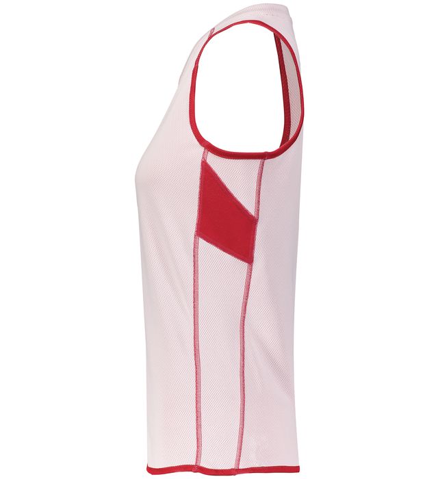 Colors side is 100% polyester with color secure® technology that helps prevent dye migration White side is 100% polyester dispersed dye Single ply, not bonded or fused Wicks Moisture Updated tailored fit Ladies' fit Outside locker label Modified V-neck collar Racerback styling Contrast color inserts Designed to be NFHS compliant