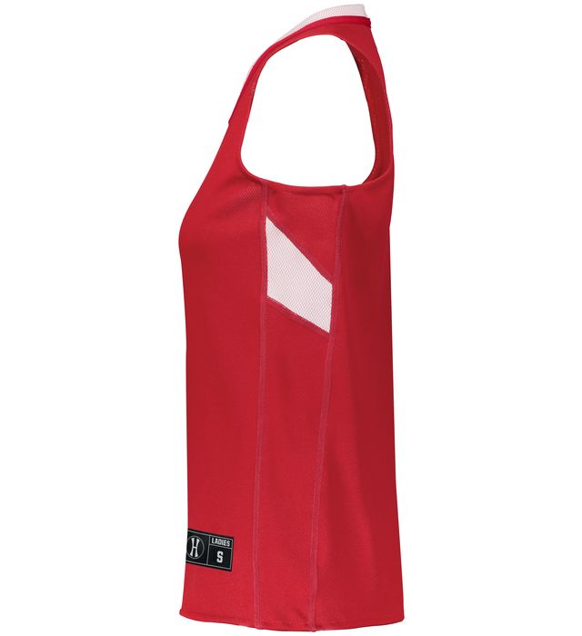 The Dual-Side Single Ply Ladies Reversible Jersey by Holloway features 1 piece of reversible mesh fabric. Decoration-friendly color secure® technology helps prevent dye migration from screen printing while moisture wicking technology keeps you cool and dry up and down the court. This lightweight women's basketball jersey is made from 100% polyester fabric and features a V-neck and an updated tailored fit.