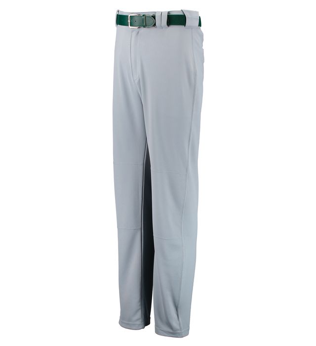 The Russell Athletic® Youth Boot Cut Game Pant is designed for young baseball players. These pants are constructed from 11 ounces per linear yard of 100% polyester double knit, offering durability and comfort for players. They feature a customizable braid option, an elastic waistband with tunnel belt loops, a two-snap closure, and a zipper fly. Practical features include two set-in double welt back pockets, a double stitched crotch gusset, and reinforced knees. The open bottom boot cut design and graded inseam cater to various sizes, providing a comfortable fit for young athletes.